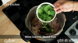 7. Now, add mint leaves, green chili and saute for 1 min